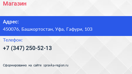 Магазин по адресу 450076, Башкортостан, Уфа, Гафури, 103 в дальнейшем Организация, размещена в следующих категориях: