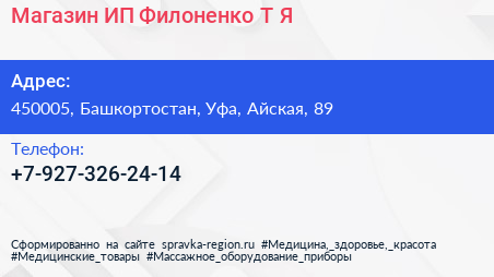 Магазин, ИП Филоненко Т.Я. по адресу 450005, Башкортостан, Уфа, Айская, 89 в дальнейшем Организация, размещена в следующих категориях: