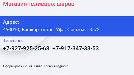 Магазин гелиевых шаров по адресу 450010, Башкортостан, Уфа, Союзная, 35/2 в дальнейшем Организация, размещена в следующих категориях: