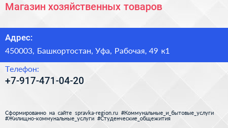 Магазин хозяйственных товаров по адресу 450003, Башкортостан, Уфа, Рабочая, 49 к1 в дальнейшем Организация, размещена в следующих категориях: