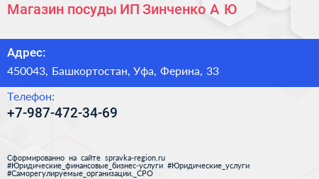 Магазин посуды, ИП Зинченко А.Ю. по адресу 450043, Башкортостан, Уфа, Ферина, 33 в дальнейшем Организация, размещена в следующих категориях: