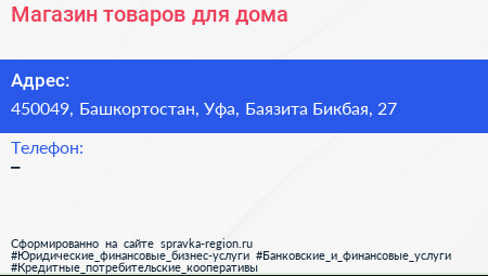 Магазин товаров для дома по адресу 450049, Башкортостан, Уфа, Баязита Бикбая, 27 в дальнейшем Организация, размещена в следующих категориях: