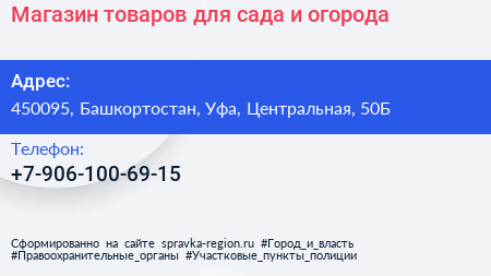 Магазин товаров для сада и огорода по адресу 450095, Башкортостан, Уфа, Центральная, 50Б в дальнейшем Организация, размещена в следующих категориях: