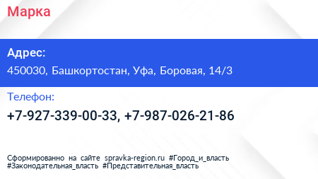 Марка по адресу 450030, Башкортостан, Уфа, Боровая, 14/3 в дальнейшем Организация, размещена в следующих категориях: