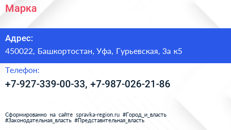 Марка по адресу 450022, Башкортостан, Уфа, Гурьевская, 3а к5 в дальнейшем Организация, размещена в следующих категориях: