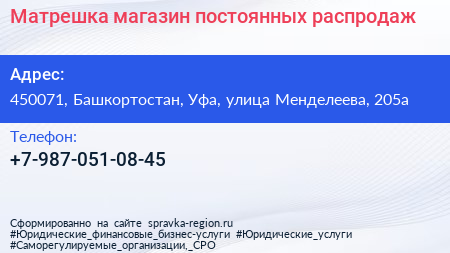 Матрешка, магазин постоянных распродаж по адресу 450071, Башкортостан, Уфа, улица Менделеева, 205а в дальнейшем Организация, размещена в следующих категориях:
