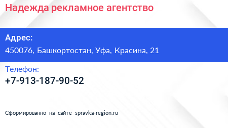 Надежда, рекламное агентство по адресу 450076, Башкортостан, Уфа, Красина, 21 в дальнейшем Организация, размещена в следующих категориях: