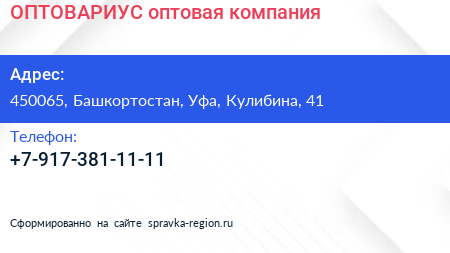 ОПТОВАРИУС, оптовая компания по адресу 450065, Башкортостан, Уфа, Кулибина, 41 в дальнейшем Организация, размещена в следующих категориях: