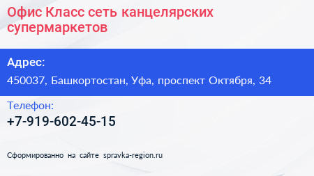 Офис-Класс, сеть канцелярских супермаркетов по адресу 450037, Башкортостан, Уфа, проспект Октября, 34 в дальнейшем Организация, размещена в следующих категориях: