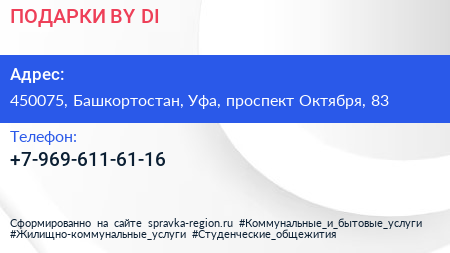 ПОДАРКИ BY DI по адресу 450075, Башкортостан, Уфа, проспект Октября, 83 в дальнейшем Организация, размещена в следующих категориях: