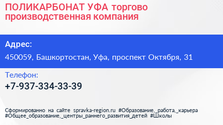 ПОЛИКАРБОНАТ-УФА, торгово-производственная компания по адресу 450059, Башкортостан, Уфа, проспект Октября, 31 в дальнейшем Организация, размещена в следующих категориях: