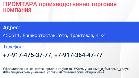 ПРОМТАРА, производственно-торговая компания по адресу 450511, Башкортостан, Уфа, Трактовая, 4 к4 в дальнейшем Организация, размещена в следующих категориях: