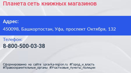 Планета, сеть книжных магазинов по адресу 450098, Башкортостан, Уфа, проспект Октября, 132 в дальнейшем Организация, размещена в следующих категориях: