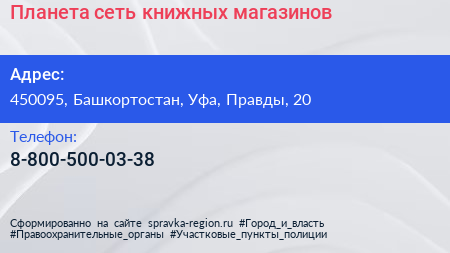Планета, сеть книжных магазинов по адресу 450095, Башкортостан, Уфа, Правды, 20 в дальнейшем Организация, размещена в следующих категориях: