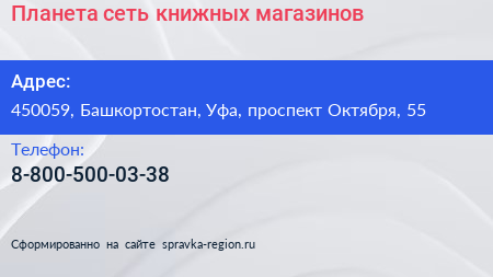 Планета, сеть книжных магазинов по адресу 450059, Башкортостан, Уфа, проспект Октября, 55 в дальнейшем Организация, размещена в следующих категориях: