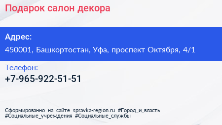 Подарок, салон декора по адресу 450001, Башкортостан, Уфа, проспект Октября, 4/1 в дальнейшем Организация, размещена в следующих категориях: