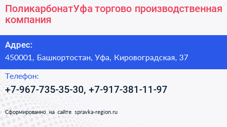 ПоликарбонатУфа, торгово-производственная компания по адресу 450001, Башкортостан, Уфа, Кировоградская, 37 в дальнейшем Организация, размещена в следующих категориях:
