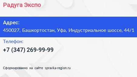 Радуга-Экспо по адресу 450027, Башкортостан, Уфа, Индустриальное шоссе, 44/1 в дальнейшем Организация, размещена в следующих категориях: