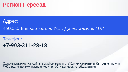 Регион Переезд по адресу 450050, Башкортостан, Уфа, Дагестанская, 10/1 в дальнейшем Организация, размещена в следующих категориях: