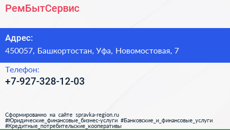 РемБытСервис по адресу 450057, Башкортостан, Уфа, Новомостовая, 7 в дальнейшем Организация, размещена в следующих категориях: