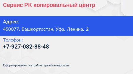 Сервис РК, копировальный центр по адресу 450077, Башкортостан, Уфа, Ленина, 2 в дальнейшем Организация, размещена в следующих категориях: