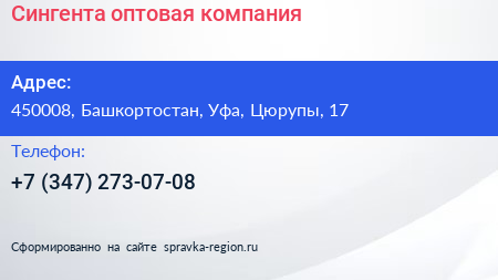 Сингента, оптовая компания по адресу 450008, Башкортостан, Уфа, Цюрупы, 17 в дальнейшем Организация, размещена в следующих категориях: