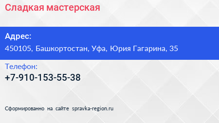 Сладкая мастерская по адресу 450105, Башкортостан, Уфа, Юрия Гагарина, 35 в дальнейшем Организация, размещена в следующих категориях: