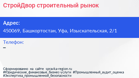 СтройДвор, строительный рынок по адресу 450069, Башкортостан, Уфа, Изыскательская, 2/1 в дальнейшем Организация, размещена в следующих категориях: