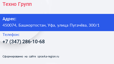 Техно-Групп по адресу 450074, Башкортостан, Уфа, улица Пугачёва, 300/1 в дальнейшем Организация, размещена в следующих категориях: