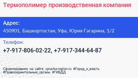 Термополимер, производственная компания по адресу 450901, Башкортостан, Уфа, Юрия Гагарина, 1/2 в дальнейшем Организация, размещена в следующих категориях:
