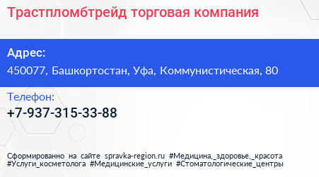 Трастпломбтрейд, торговая компания по адресу 450077, Башкортостан, Уфа, Коммунистическая, 80 в дальнейшем Организация, размещена в следующих категориях: