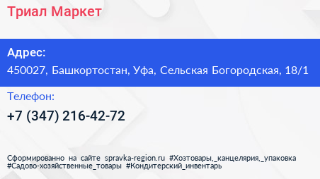 Триал Маркет по адресу 450027, Башкортостан, Уфа, Сельская Богородская, 18/1 в дальнейшем Организация, размещена в следующих категориях:
