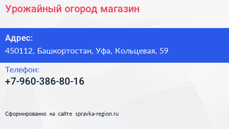 Урожайный огород, магазин по адресу 450112, Башкортостан, Уфа, Кольцевая, 59 в дальнейшем Организация, размещена в следующих категориях: