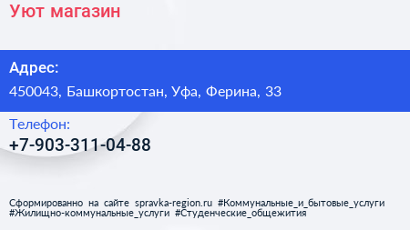 Уют, магазин по адресу 450043, Башкортостан, Уфа, Ферина, 33 в дальнейшем Организация, размещена в следующих категориях: