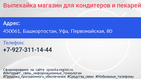 Выпекайка, магазин для кондитеров и пекарей по адресу 450061, Башкортостан, Уфа, Первомайская, 80 в дальнейшем Организация, размещена в следующих категориях: