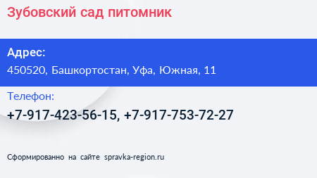 Зубовский, сад-питомник по адресу 450520, Башкортостан, Уфа, Южная, 11 в дальнейшем Организация, размещена в следующих категориях: