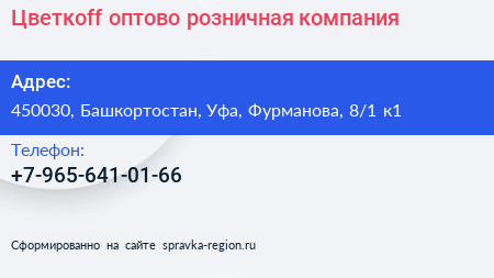 Цветкоff, оптово-розничная компания по адресу 450030, Башкортостан, Уфа, Фурманова, 8/1 к1 в дальнейшем Организация, размещена в следующих категориях: