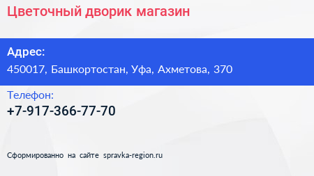 Цветочный дворик, магазин по адресу 450017, Башкортостан, Уфа, Ахметова, 370 в дальнейшем Организация, размещена в следующих категориях: