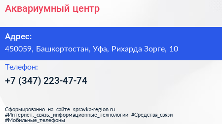 Аквариумный центр по адресу 450059, Башкортостан, Уфа, Рихарда Зорге, 10 в дальнейшем Организация, размещена в следующих категориях: