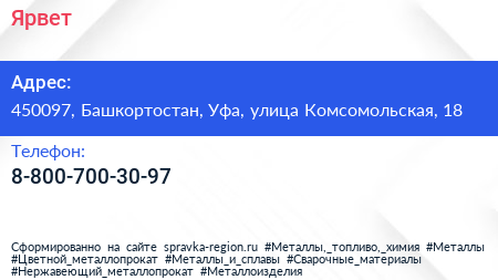 Ярвет по адресу 450097, Башкортостан, Уфа, улица Комсомольская, 18 в дальнейшем Организация, размещена в следующих категориях: