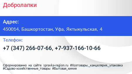 Добролапки по адресу 450014, Башкортостан, Уфа, Яктыкульская, 4 в дальнейшем Организация, размещена в следующих категориях: