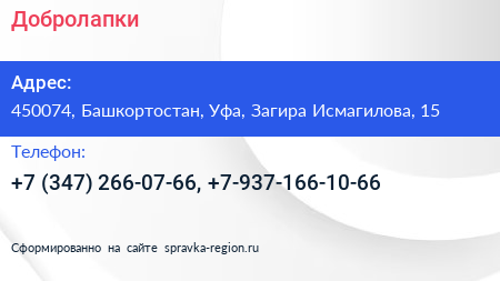 Добролапки по адресу 450074, Башкортостан, Уфа, Загира Исмагилова, 15 в дальнейшем Организация, размещена в следующих категориях: