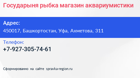 Государыня рыбка, магазин аквариумистики по адресу 450017, Башкортостан, Уфа, Ахметова, 311 в дальнейшем Организация, размещена в следующих категориях: