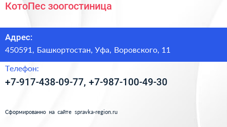 КотоПес, зоогостиница по адресу 450591, Башкортостан, Уфа, Воровского, 11 в дальнейшем Организация, размещена в следующих категориях: