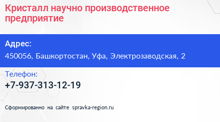 Кристалл, научно-производственное предприятие по адресу 450056, Башкортостан, Уфа, Электрозаводская, 2 в дальнейшем Организация, размещена в следующих категориях: