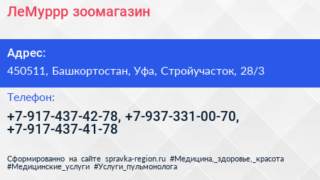 ЛеМуррр, зоомагазин по адресу 450511, Башкортостан, Уфа, Стройучасток, 28/3 в дальнейшем Организация, размещена в следующих категориях: