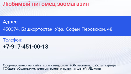 Любимый питомец, зоомагазин по адресу 450074, Башкортостан, Уфа, Софьи Перовской, 48 в дальнейшем Организация, размещена в следующих категориях: