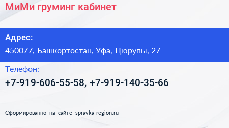 МиМи, груминг-кабинет по адресу 450077, Башкортостан, Уфа, Цюрупы, 27 в дальнейшем Организация, размещена в следующих категориях: