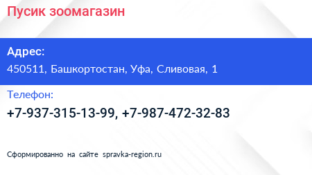 Пусик, зоомагазин по адресу 450511, Башкортостан, Уфа, Сливовая, 1 в дальнейшем Организация, размещена в следующих категориях: