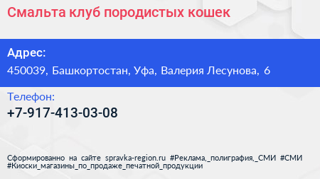 Смальта, клуб породистых кошек по адресу 450039, Башкортостан, Уфа, Валерия Лесунова, 6 в дальнейшем Организация, размещена в следующих категориях: